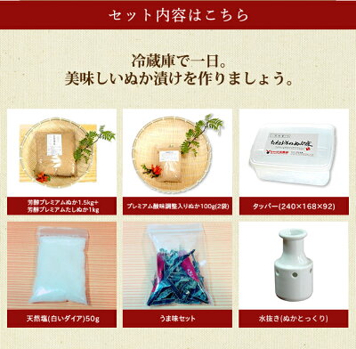商品名称 芳醇プレミアムぬか床スタートセット 内容 芳醇プレミアムぬか1.5kg+プレミアム酸味調整煎りぬか100g(2袋)+芳醇プレミアム足しぬか1kg+天然塩50g+うま味セット(昆布&鷹の爪)+タッパー+水抜き(ぬかとっくり) 賞味期限 6ヶ月※ 開封後かき混ぜて手入れをすれば、ずっとお使いいただけます。