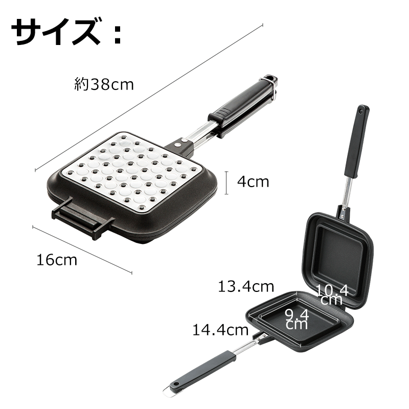 商品説明商品名サンドdeグルメ KS-2887 サイズ外寸:約160×380×40mm 内寸:約134×144×17mm 個装サイズ:17×38×5cm 重量:約1.18kg 材質本体:アルミニウム合金(フッ素樹脂加工) 貼底:ステンレス鋼(クロム18%、底の厚さ4.2mm(貼底含む)) ハンドル本体:フェノール樹脂 金具:ステンレス鋼(クロム18%) 原産地日本 商品詳細美味しい本格ホットサンドが楽しめる♪