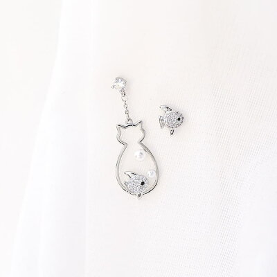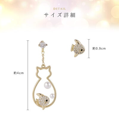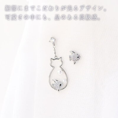 レディース ピアス ジュエリー 猫 ねこ 魚 アシンメトリー 個性的 ジルコニア パール | 銀 シルバー925 純銀 針 【金属アレルギー対応】