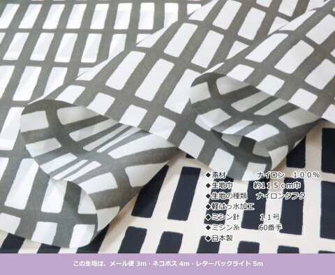 ◆素材 ナイロン 100%................... ◆生地巾 約118cm幅................... ◆生地の種類 ナイロンタフタ................... ◆軽はっ水加工................... ◆ミシン針 11号................... ◆ミシン糸 60番手................... ◆日本製................... ▼この生地はご使用前の水通しは必要ないです。